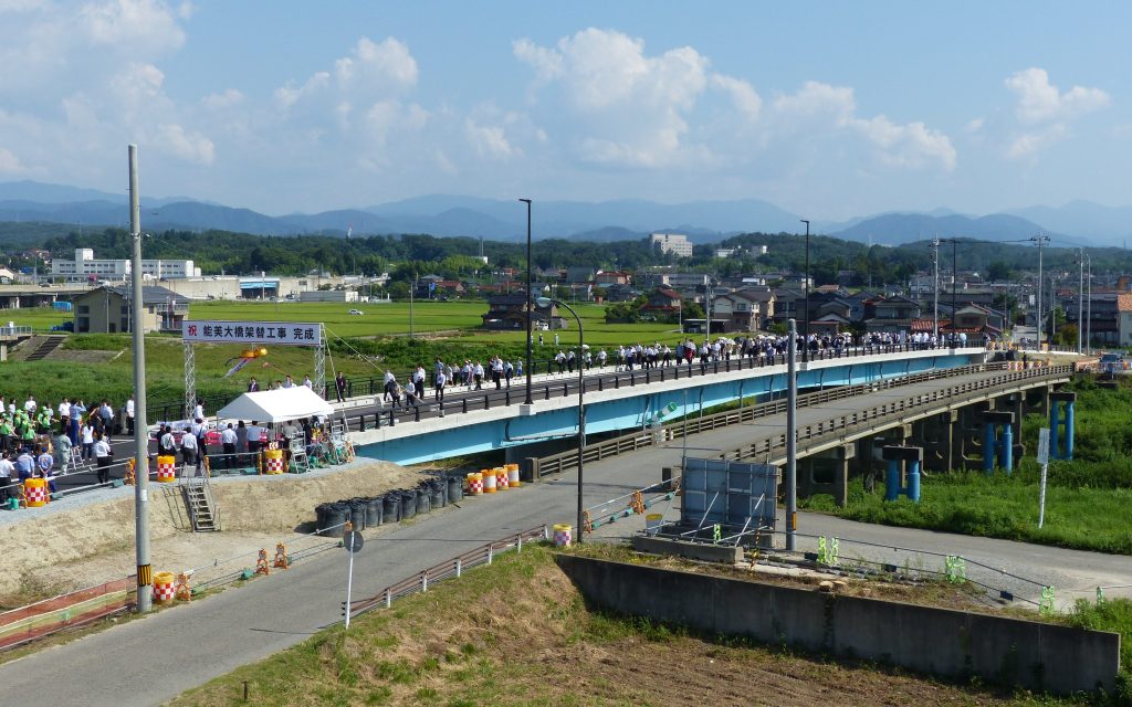 7/23(日)に能美大橋架替工事完成式典が行われました。馳浩知事や佐々木紀衆院議員、宮本周司財務大臣政務官、宮橋勝栄市長、遠藤仁彦北陸地方整備局長の方々がテープカット、くす玉割りをしました。その後、小松市立高校吹奏楽部の演奏に合わせて関係者や地域住民の方々と一緒に能美大橋の渡り初めをしました。
